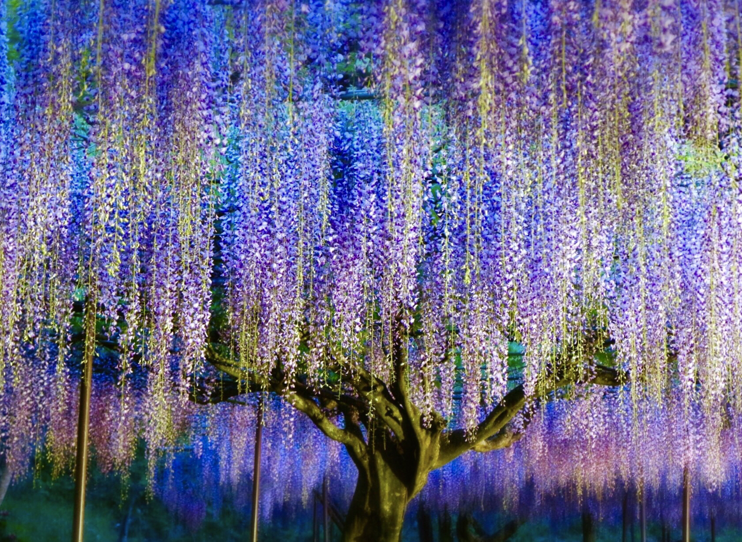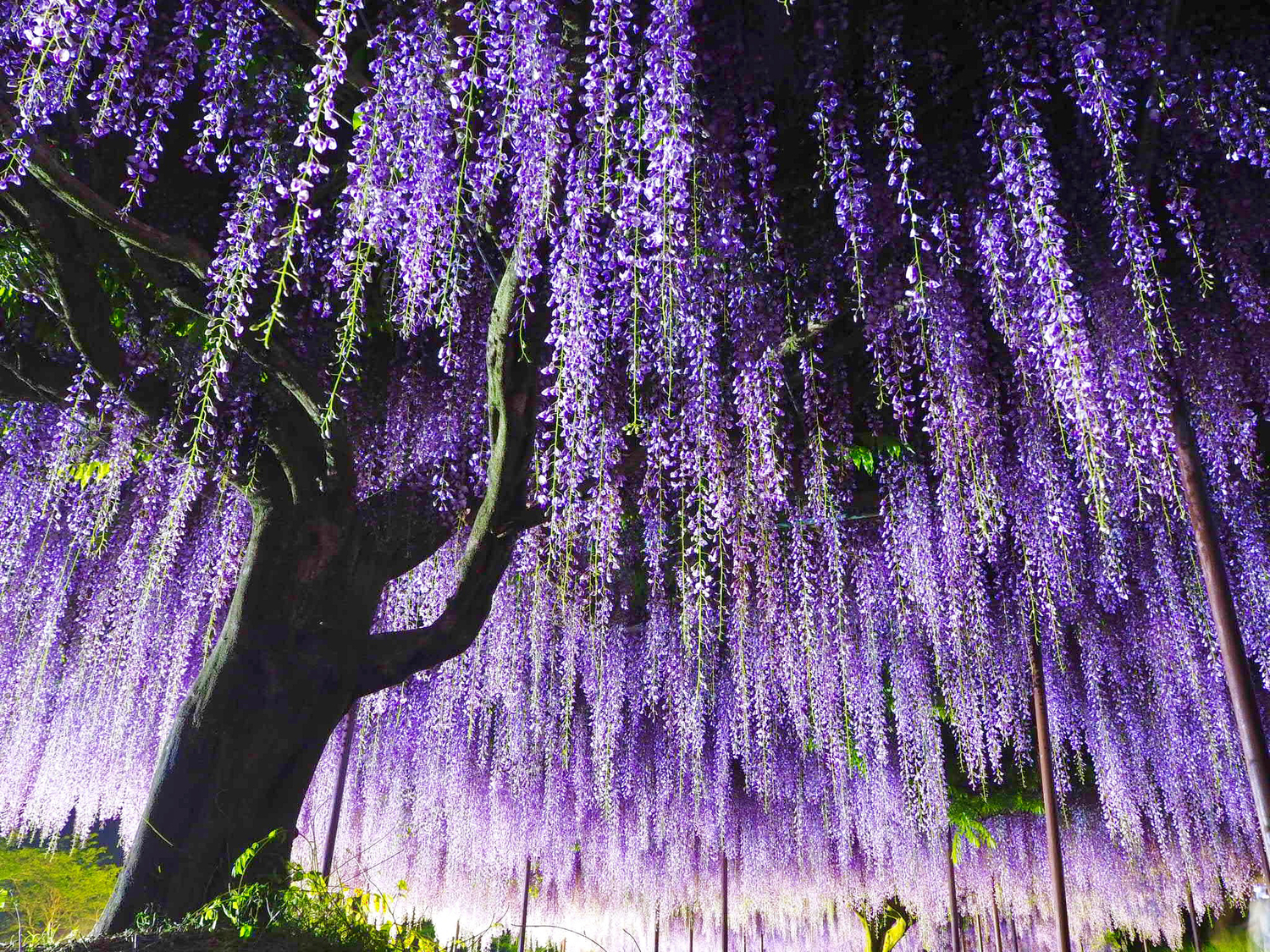 เมื่อดอกบาน ช่อดอกวิสทีเรียสีม่วงเข้มจะห้อยลงมายาวถึง 150 เซนติเมตร การได้เดินลอดใต้อุโมงค์สีม่วงที่ส่งกลิ่นหอมอ่อนๆ จะทำให้คุณรู้สึกเหมือนหลุดเข้าไปในโลกเทพนิยาย ช่วงปลายเมษาถึงพฤษภาคมจะมีการจัดเทศกาลและเปิดไฟไลท์อัพตอนกลางคืน สวยงามจนสะกดทุกสายตาแน่นอน