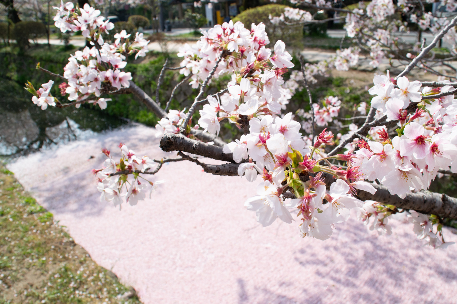 ในช่วงฤดูใบไม้ผลิ ซากุระสองฝั่งจะบานสะพรั่งจนกลายเป็นอุโมงค์สีชมพูขาว และถ้าคุณโชคดีไปเยือนในช่วงที่ดอกเริ่มร่วง คุณจะได้เห็น “ซากุระฟุบุกิ” หรือพายุกลีบซากุระร่วงหล่นลงมาปกคลุมผิวน้ำจนกลายเป็นสายน้ำสีชมพู เป็นภาพโรแมนติกที่เหมือนหลุดออกมาจากอนิเมะเลยล่ะ