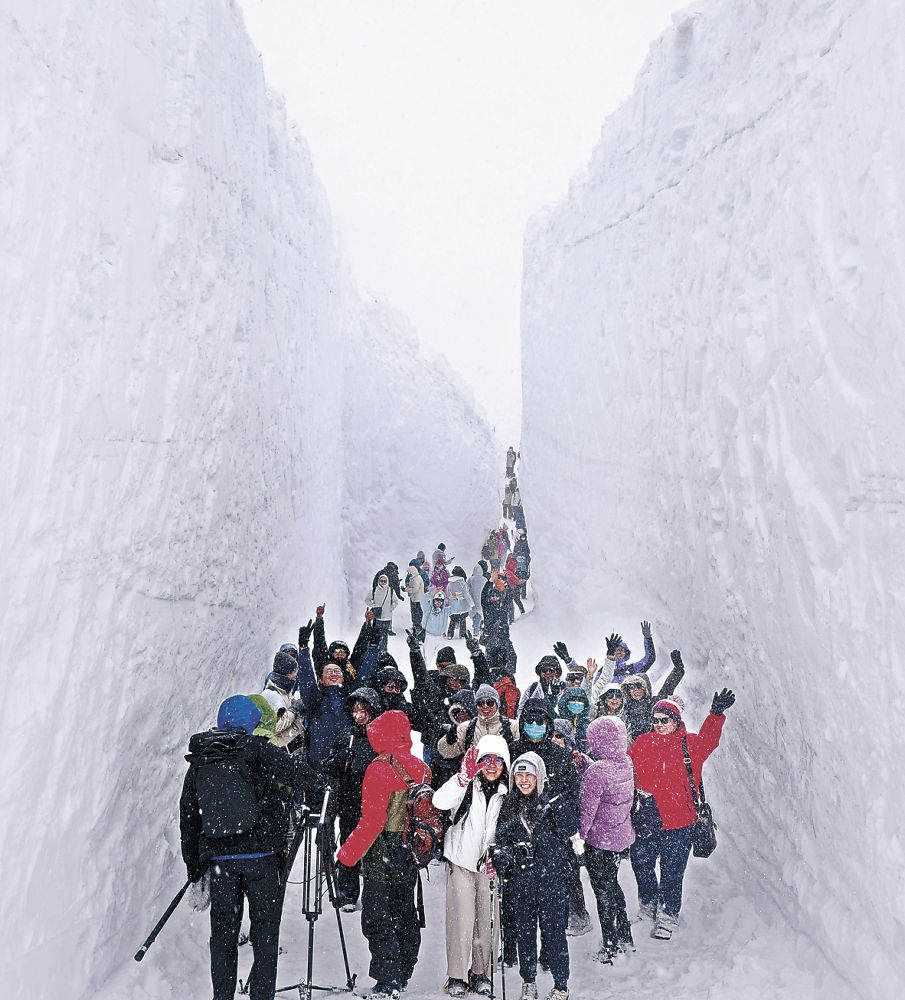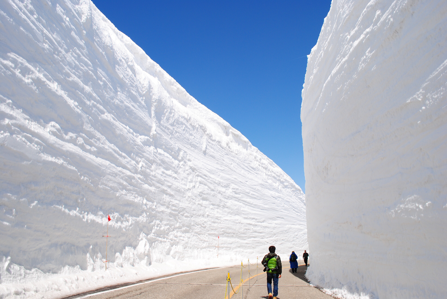 ตั้งแต่กลางเดือนเมษายนถึงกลางเดือนมิถุนายน จะมีการเปิดเส้นทางให้รถบัสวิ่งผ่านช่องเขาหิมะที่ถูกขุดเจาะเป็นระยะทาง 500 เมตร เกิดเป็น “กำแพงหิมะ” สูงตระหง่านถึง 18 เมตรขนาบสองข้างทาง! คุณสามารถลงไปเดินเล่น สัมผัสความยิ่งใหญ่ของกำแพงหิมะที่ตัดกับท้องฟ้าสีคราม เป็นประสบการณ์สุดมหัศจรรย์เหมือนได้ยืนอยู่ระหว่างสองฤดูกาลในเวลาเดียวกัน