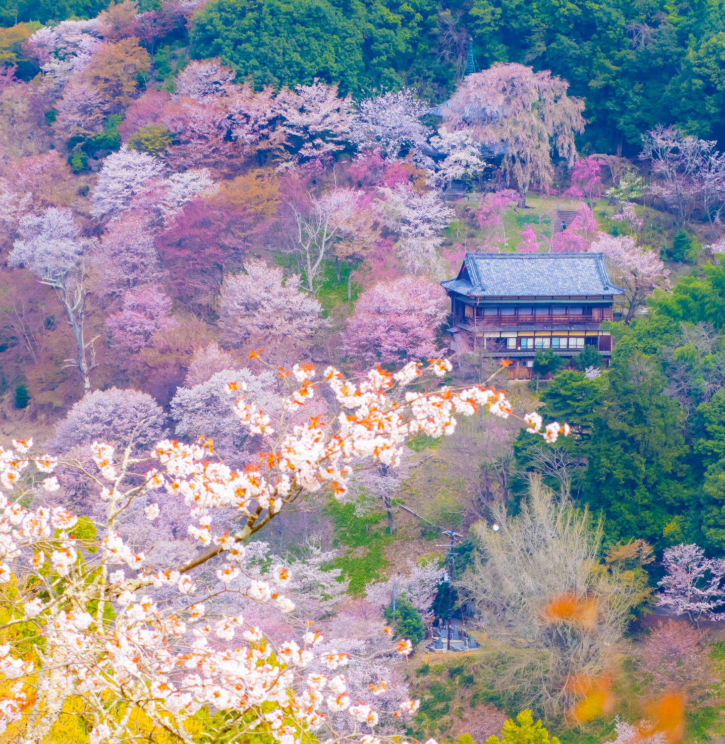 ภูเขาโยชิโนะไม่ได้เป็นเพียงสถานที่ศักดิ์สิทธิ์ทางศาสนา แต่ยังเป็นจุดชมซากุระที่ยิ่งใหญ่อลังการที่สุดแห่งหนึ่งของญี่ปุ่น เมื่อเข้าสู่เดือนเมษายน ซากุระกว่า 30,000 ต้นจะบานสะพรั่งปกคลุมไปทั้งหุบเขา เป็นภาพความงามที่ผู้คนกล่าวขานกันมาตั้งแต่สมัยโบราณ