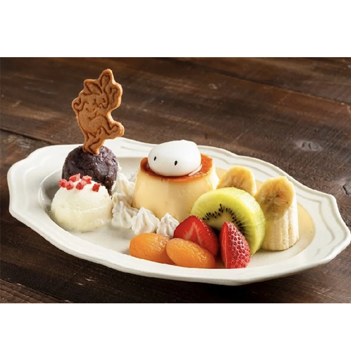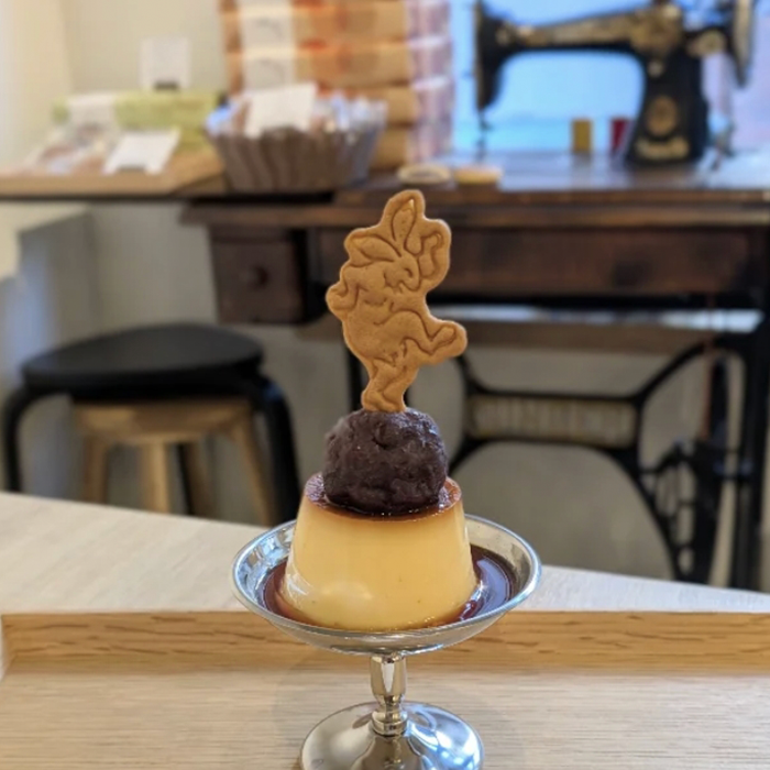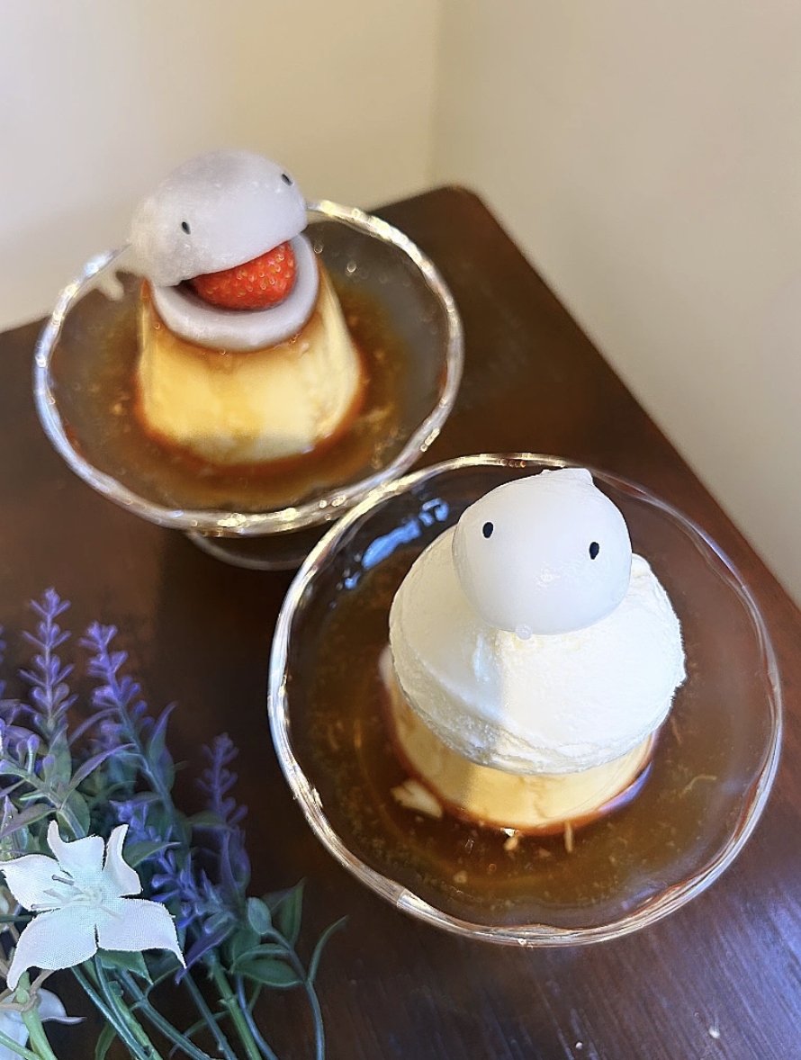 มาถึงเมนูไฮไลต์สำหรับคนที่นั่งทานในคาเฟ่เท่านั้น กับ “พุดดิ้งโชวะ” (特製レトロプリン) พุดดิ้งสไตล์เรโทรเนื้อเนียนนุ่ม ที่คุณสามารถสั่งท็อปปิ้งเพิ่มความน่ารักได้ตามใจชอบ! ไม่ว่าจะเป็นการโปะไดฟูกุปีศาจลงบนพุดดิ้ง, เพิ่มไดฟูกุน้ำ (Mizu Daifuku), โปะไอศกรีมวานิลลา หรือประดับด้วยคุกกี้โลโก้กระต่ายและถั่วแดงกวน ก็เนรมิตจานของหวานในฝันได้เลยค่ะ