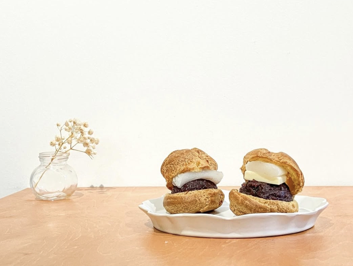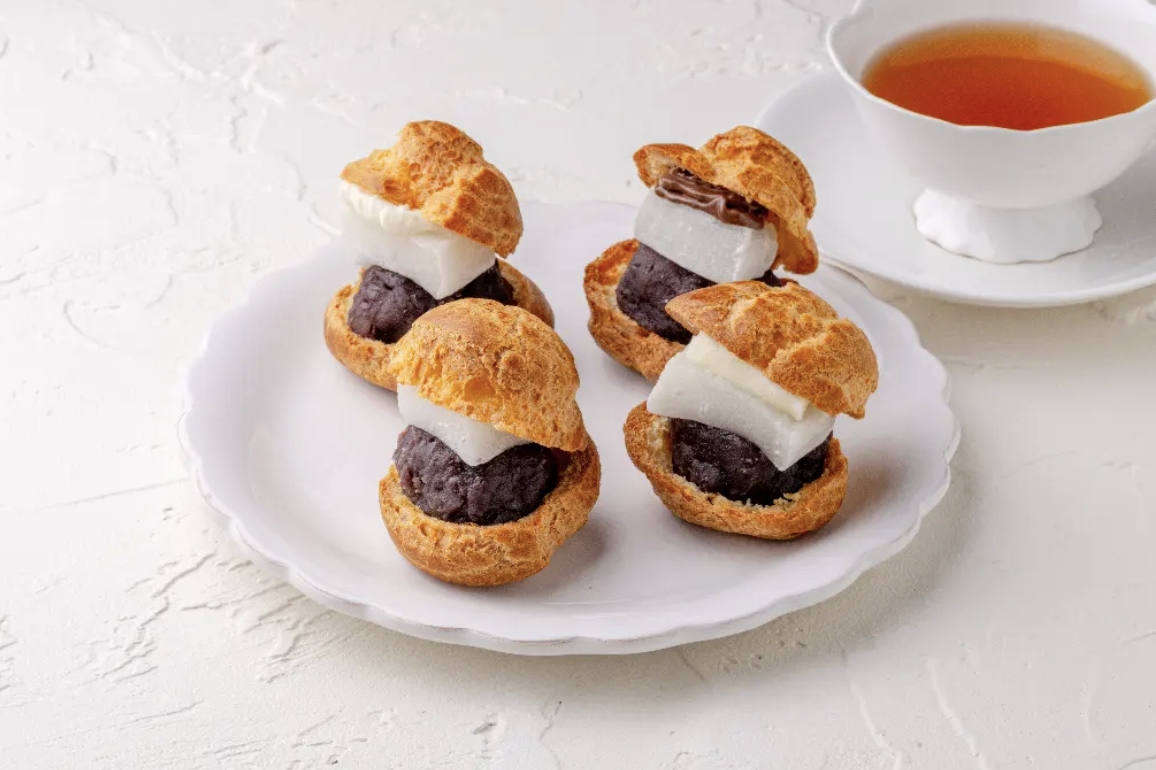นอกจากไดฟูกุแล้ว EDO USAGI ยังมีเมนูฟิวชันที่แสนจะครีเอทีฟอย่าง “ชูครีมสอดไส้กิวฮิและถั่วแดง” (生しゅうもちあん) ลืมภาพชูครีมไส้ครีมคัสตาร์ดแบบเดิมๆ ไปได้เลย! เพราะชิ้นนี้ใช้แป้งชูครีมสไตล์ฝรั่งเศส แต่สอดไส้ด้านในด้วย “กิวฮิ” (แป้งโมจินุ่มยืด) และ “ถั่วแดงกวน” ซึ่งเป็นหัวใจหลักของขนมญี่ปุ่น ถือเป็นการจับคู่ที่ลงตัวอย่างไม่น่าเชื่อค่ะ