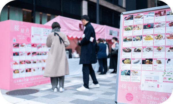 ในช่วงเทศกาล จะมีการจัดโซนร้านค้าแบบจำกัดเวลาที่ Fukutoku Garden, ถนน Naka-dori และ Ukiyo Shoji รวบรวมร้านอาหารเก่าแก่ โรงแรม และร้านดังในนิฮงบาชิ มาเสิร์ฟเมนูพิเศษให้คุณเดินชิมไปพร้อมกับชมซากุระ