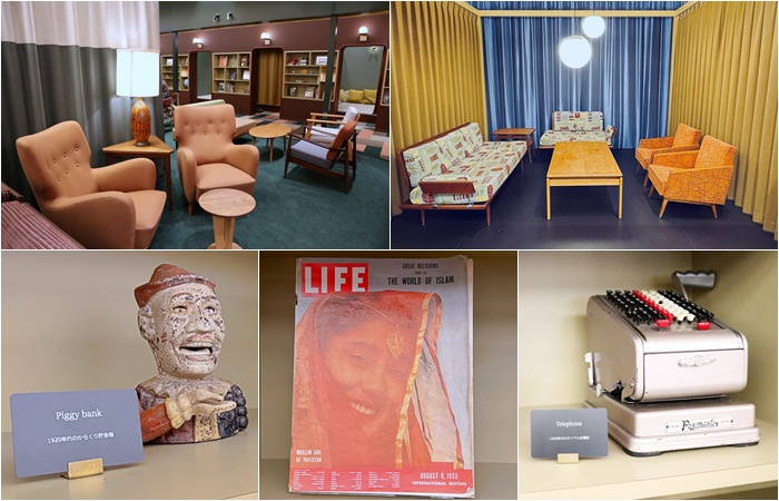 โซนพักผ่อนนี้ตกแต่งด้วยเฟอร์นิเจอร์สไตล์เรโทรหลากหลายแบบ ลองสังเกตดีๆ จะเห็นว่าโต๊ะเก้าอี้แต่ละตัวมีดีไซน์และลวดลายไม่ซ้ำกันเลย ของตกแต่ง นิตยสาร และของประดับอื่นๆ ก็เป็นสไตล์อเมริกันปี 1955 ทั้งหมด พร้อมมีป้ายแนะนำของใช้สไตล์เรโทรเหล่านี้ด้วย ทุกคน สามารถเลือกที่นั่งตามที่ชอบ แล้วหามุมถ่ายรูปเก๋ๆ ได้ตามสบายเลย!